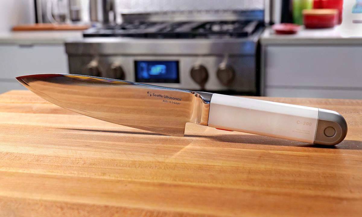 The Seattle Ultrasonics C-200 is a kitchen knife that uses ultrasonic technology to enhance its cutting ability by vibrating at high frequencies.