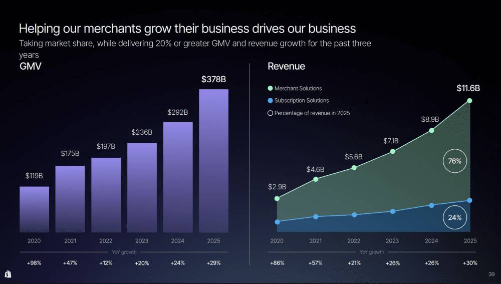 - Shopify's core business remains exceptionally strong: 30% revenue growth at 2B in free cash flow and accelerating GMV growth at $378B (+29%) as reported by Shopify's Q4 2025 financial results.