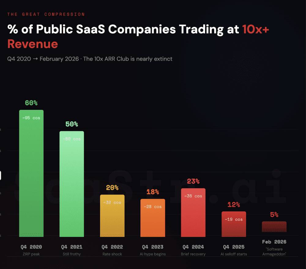 - The 10x ARR Club contracted from 60% of public B2B companies in Q4 2020 to fewer than 5 companies by Q1 2026, driven by interest rate increases, growth deceleration, and AI disruption fears