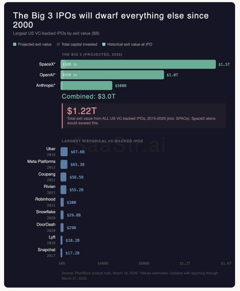 SpaceX, OpenAI, and Stripe's combined IPO valuations are projected to surpass $500 billion, eclipsing past major IPOs like Alibaba and Facebook.