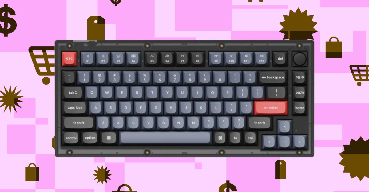 The Keychron V1 is a customizable mechanical keyboard known for its hot-swappable switches, RGB backlighting, and compact design. It's priced at $45, making it an affordable option for tech enthusiasts.