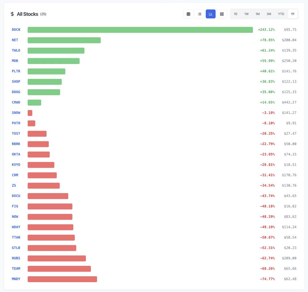 A 12-month recovery in names like DOCN (+234%), NET (+79%), TWLO (+62%), MDB (+56%), and PLTR (+44%) means the narrative “AI is killing software” is too simple.